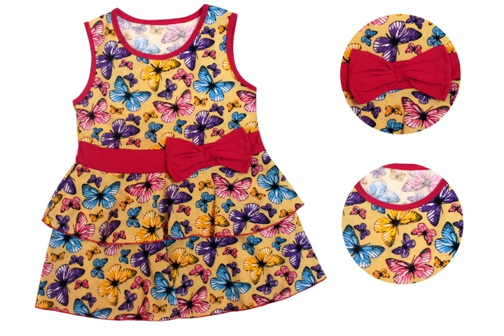 Платье для девочки полуприлегающего силуэта. Перед и спинка отрезные по линии талии. Юбка расклешенная с воланом по талии. Горловина и проймы окантованы бейкой из отделочного полотна. Линия талии оформлена притачным поясом из отделочного полотна с декоративным бантом спереди.
