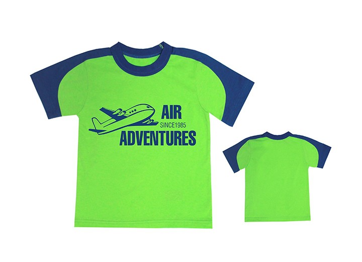 Фуфайка для мальчика с втачным рукавом. Перед и спинка цельнокроеные. Рукава одношовные короткие. В средней части рукава расположена вставка из полотна отделочного цвета, переходящая в реглан. Горловина окантована бейкой из отделочного полотна. Нижние срезы рукавов и низ фуфайки подшиты швом вподгибку с открытым срезом. Перед декорирован печатью.